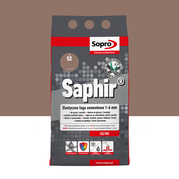 Oferujemy SOPRO 9521A_SAPHIR Elastyczny Cement Fugi, idealne rozwiązanie do spoinowania płytek ceramicznych i kamiennych. Nasz produkt w kolorze brązowym jest przystosowany do użycia w szerokim zakresie grubości fug, od 1 do 6 mm, co czyni go wszechstronnym wyborem dla różnych aranżacji wnętrz.