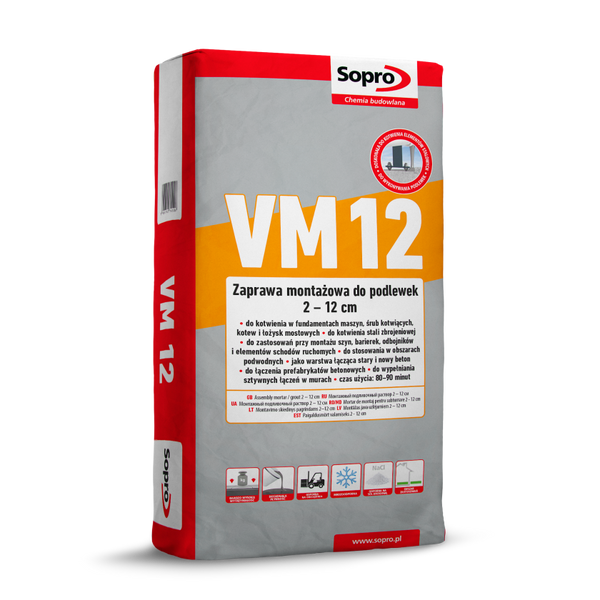 SOPRO VM 12 to zaprawa montażowa szybkowiążąca, idealna do stosowania w różnych aplikacjach budowlanych. Dzięki swojej doskonałej przyczepności, jest odpowiednia do wykonywania podkładów, napraw oraz osadzania elementów budowlanych. Produkt charakteryzuje się krótkim czasem wiązania, co pozwala na szybkie postępy w pracy.